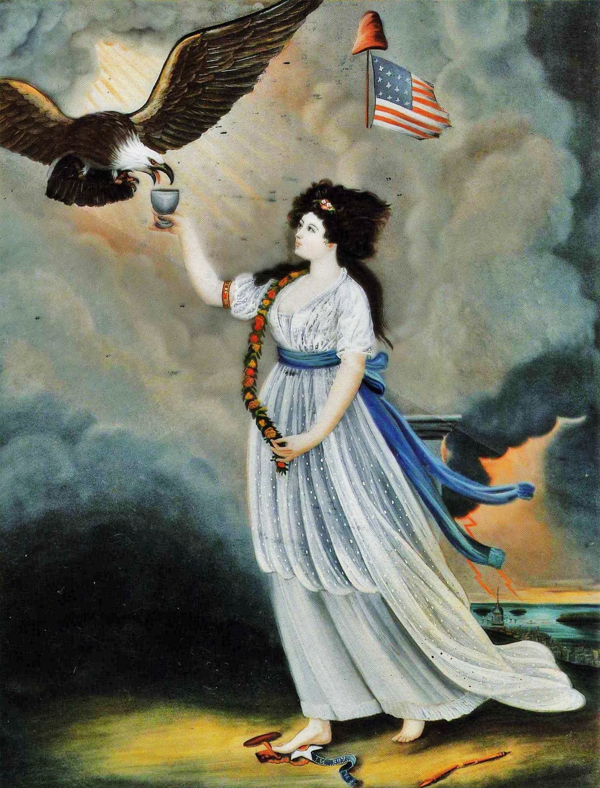 Für die obige Ausgabe des Playboy hatte sie sich ein wenig verwandelt, sie wird von einem leichten luftigen Kleid umhüllt. Das muss natürlich weiß sein, die Farbe der Unschuld. Was hier ikonographisch fehlt - und das muss man wirklich bemängeln - ist das Fehlen des roten Gürtels oder einer roten Schärpe, wie sie diese mit einem Schwert bewaffnete Lady Liberty trägt, die ein wenig älter ist. Solche Lady Liberty Postkarten waren um 1900 die ganz große Mode (und wir finden dort auch ➱Beispiele, an denen sich das Kleid von Cindy Woods orientiert). Und ich brauche wohl nicht zu sagen, dass kunsthistorisch häufig die Vorlage für all diese Damen das ➱Bild La liberté guidant le peuple von Delacroix ist. Obgleich die Dame schon ein wenig älter ist, wie das Bild von ➱Abijah Canfield aus dem Jahre 1800 zeigt (ich glaube ich schreibe demnächst einmal über die Liberty Girls).