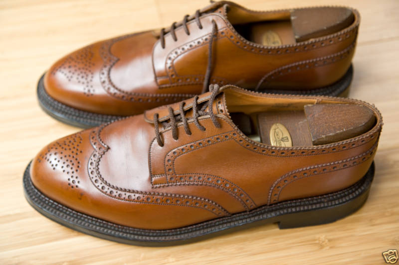 Über französische Herrenschuhe zu schreiben, bedeutet über Corthay, Aubercy (hier ihr Laden in Paris), J.M. Weston und Berluti zu schreiben, aber ich fange mal ganz anders an. Als ich noch am Schreiben des Posts ➱Italienische Herrenschuhe war, ersteigerte ich nebenbei dieses Paar Schuhe, das als feinste engl. Handarbeit einer kleinen englischen Manufaktur apostrophiert war. Es war mir klar, dass kein Wort davon wahr war, aber der Schuh war mir die 27 Euro wert. Inzwischen ist er angekommen, es ist wirklich ein guter Schuh. Ich hatte zuerst einen italienischen Fälscher vermutet, denn die Adresse auf der Innensohle war die kurioseste Sache.