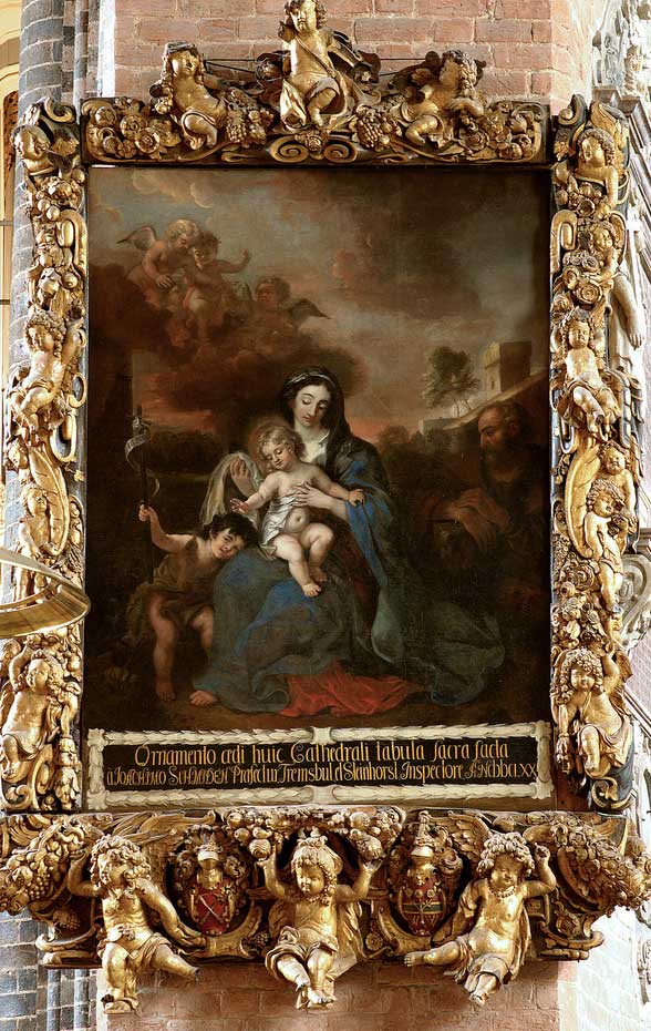 Auf einem verschollenen Epitaph im Schleswiger Dom befand sich eine lange lateinische Inschrift, aus der ich einmal einen Satz in der Übersetzung wiedergebe: Der hier gebettet wird, Georg Ovens, war seiner Kunst der Vornehmste - des Zeuxis Farben - des Apelles Bilder - - Raphaels liebliche Feinheit, bis hin zu Rembrandts Schattentiefe und kühnem Farbenauftrag - das Alles findet sich hier. Das hat im 18. Jahrhundert ein Pastor geschrieben, aber die schöne Lobpreisung des Malers, deren Text sich bei Harry Schmidt findet, stimmt nicht ganz. Ovens ist nicht in Schleswig begraben, sein Grab ist in der Sankt Christopherus Kirche in Friedrichstadt, der er auch 1675 diesen Altar geschenkt hat.