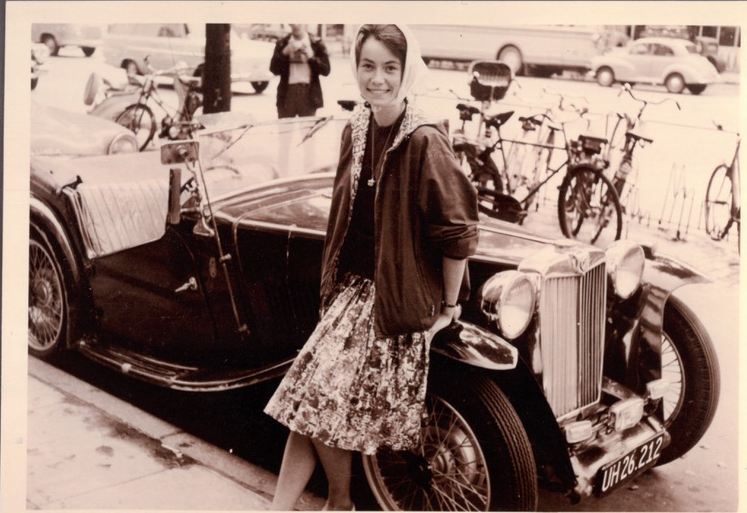 Charles Trenet, es ist viel Frankreich in dem Text. Wenn Sie beim Lesen das Gefühl haben, Sie kennen das alles schon, dann betrügt Sie ihr Gefühl nicht. Beinahe alles stand hier in den letzten zwölf Jahren schon mal im Blog. Ein Photo von der Romanfigur spendiere ich Ihnen auch. Das habe ich 1961 von ihr in Kopenhagen gemacht. Das Auto gehört ihr natürlich nicht, aber sie sieht gut damit aus.
